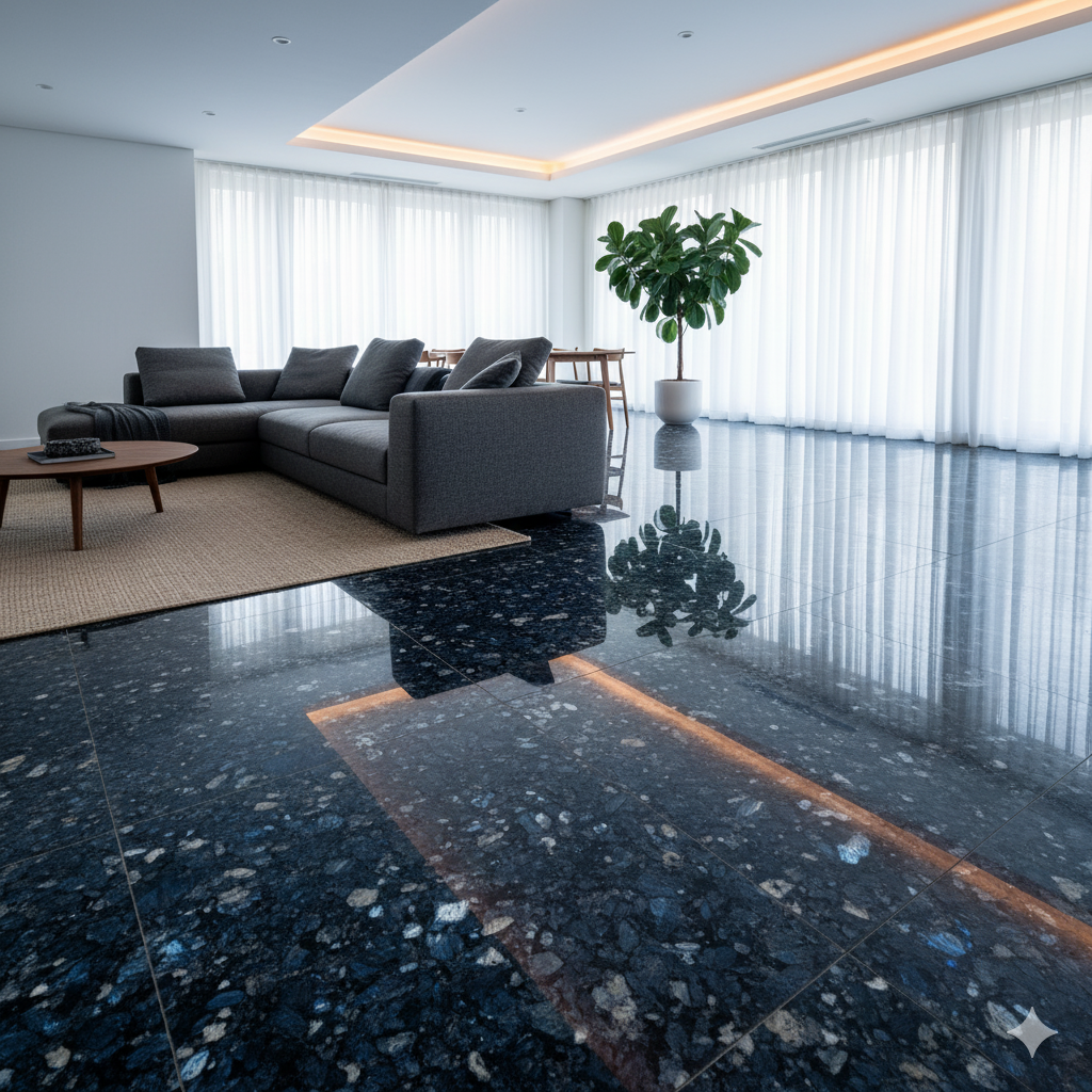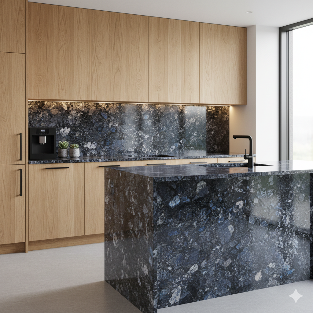 Le Granit Labrador Blue Pearl est une pierre naturelle d’origine norvégienne, célèbre pour ses reflets bleus, gris et argentés