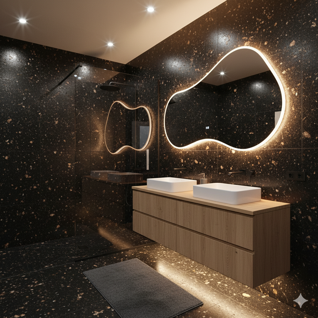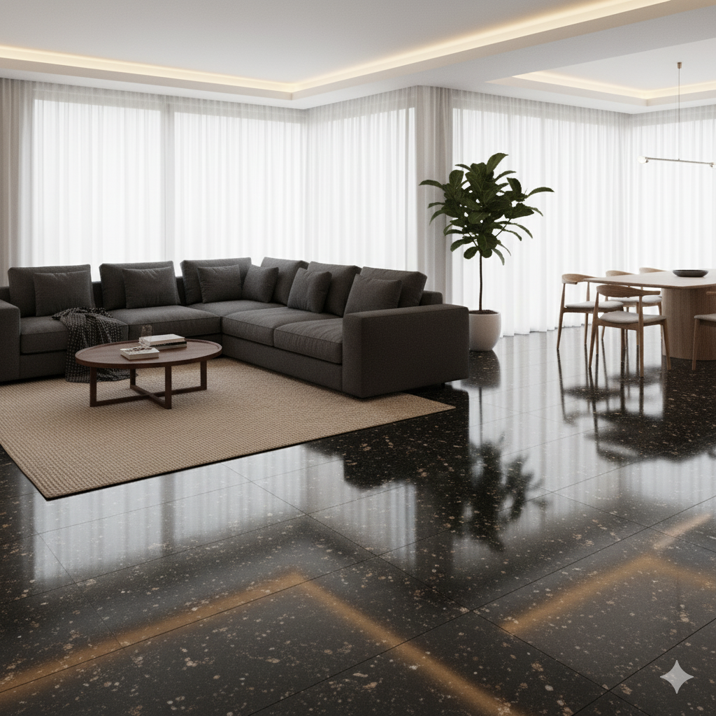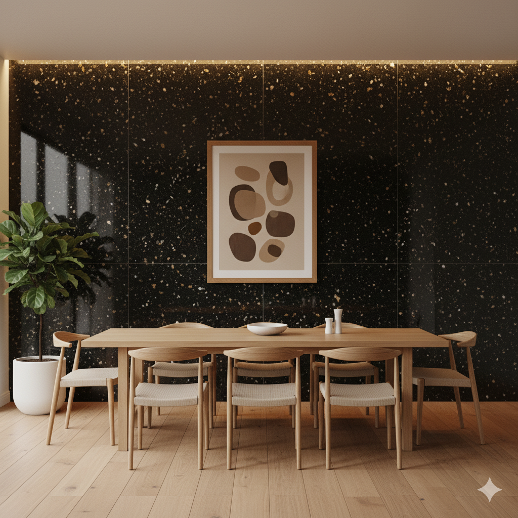 Le Granit Star Galaxy est une pierre naturelle d’origine indienne, célèbre pour son noir profond constellé de reflets dorés et cuivrés.