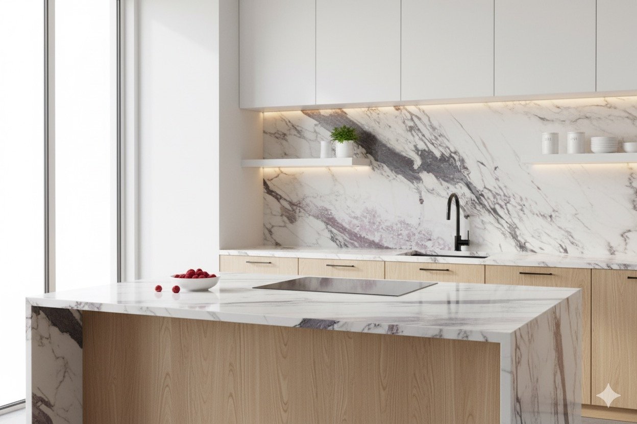 Le marbre se distingue par son aspect plus noble et ses veinages élégants, souvent choisis pour les intérieurs (plans de travail, escaliers, revêtements muraux).