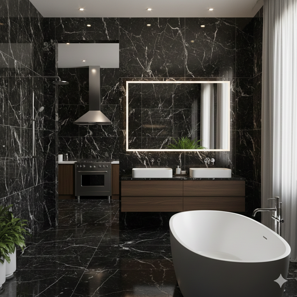 le Marquina se distingue par son rendu haut de gamme et sa capacité à sublimer les surfaces (vasques, murs, sols) lorsqu’il est correctement protégé.