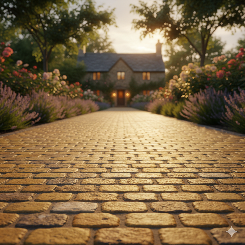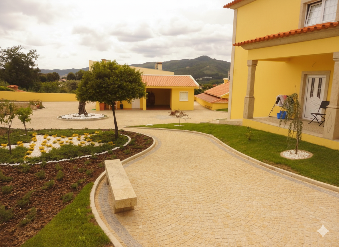 Les pavés en granit jaune du Portugal apportent une touche chaleureuse et méditerranéenne aux aménagements extérieurs.